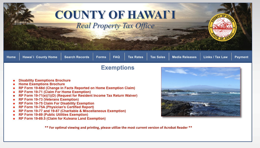 - Hawai’i County (Big Island): Exemption ranges from $40,000 to $100,000, depending on age